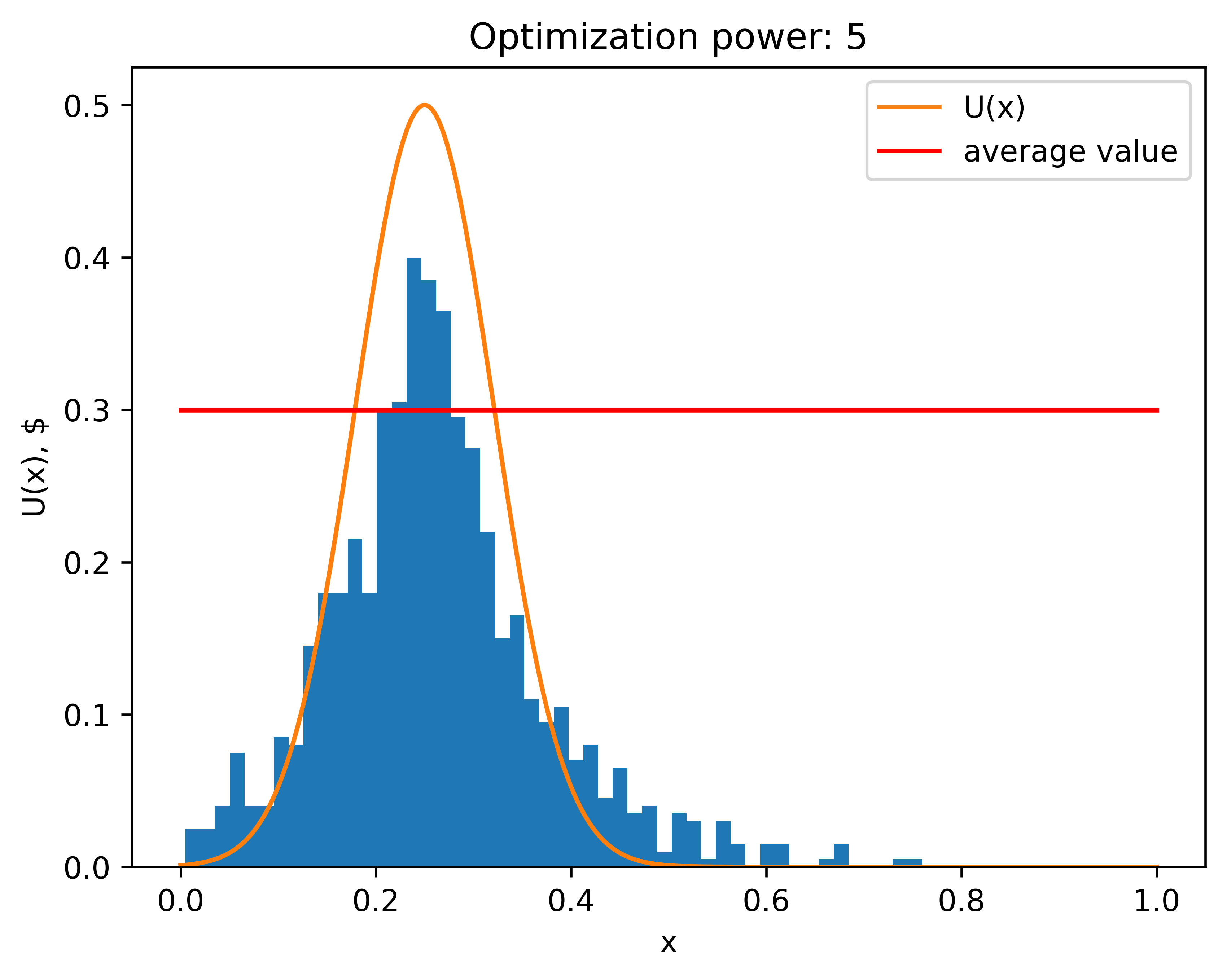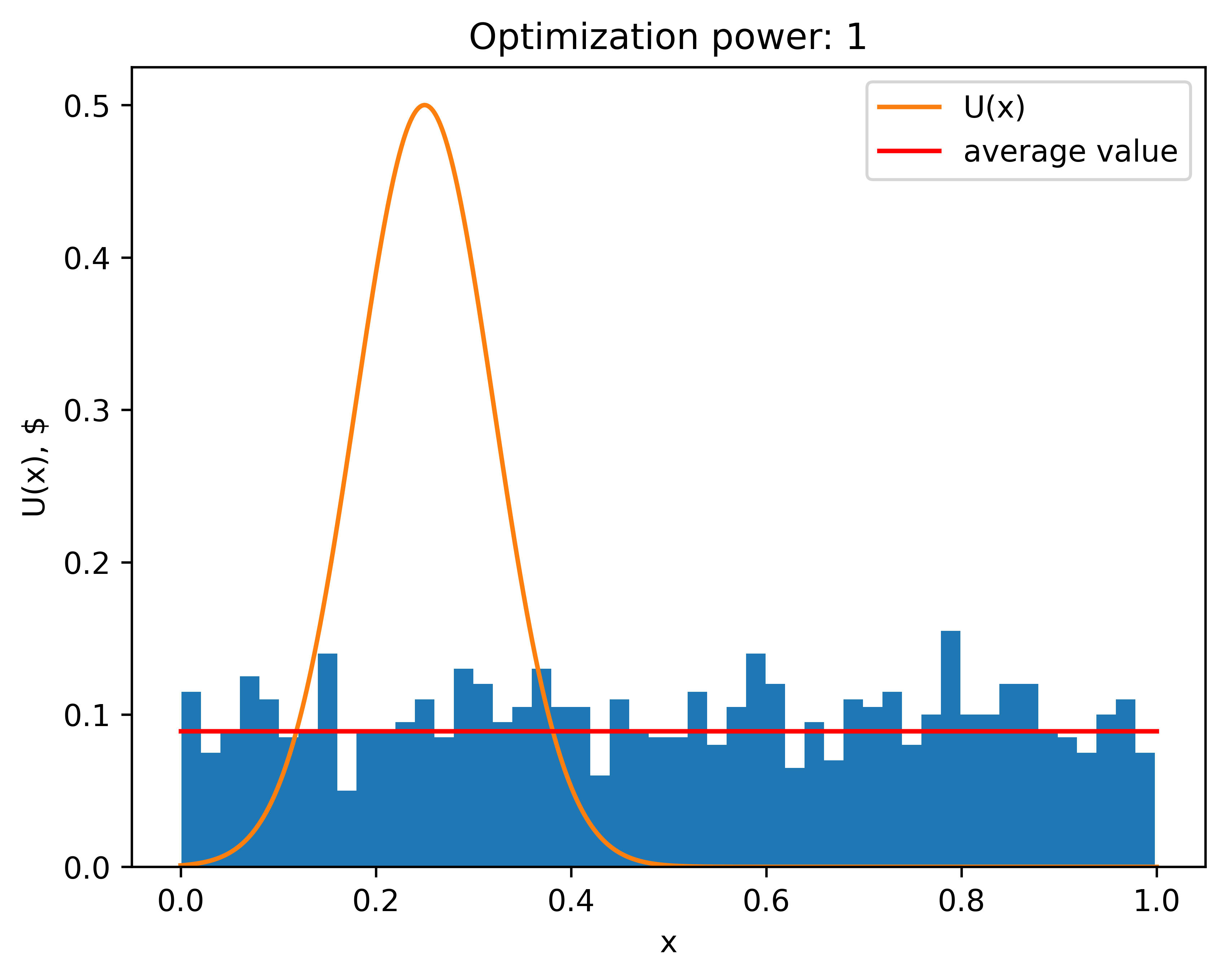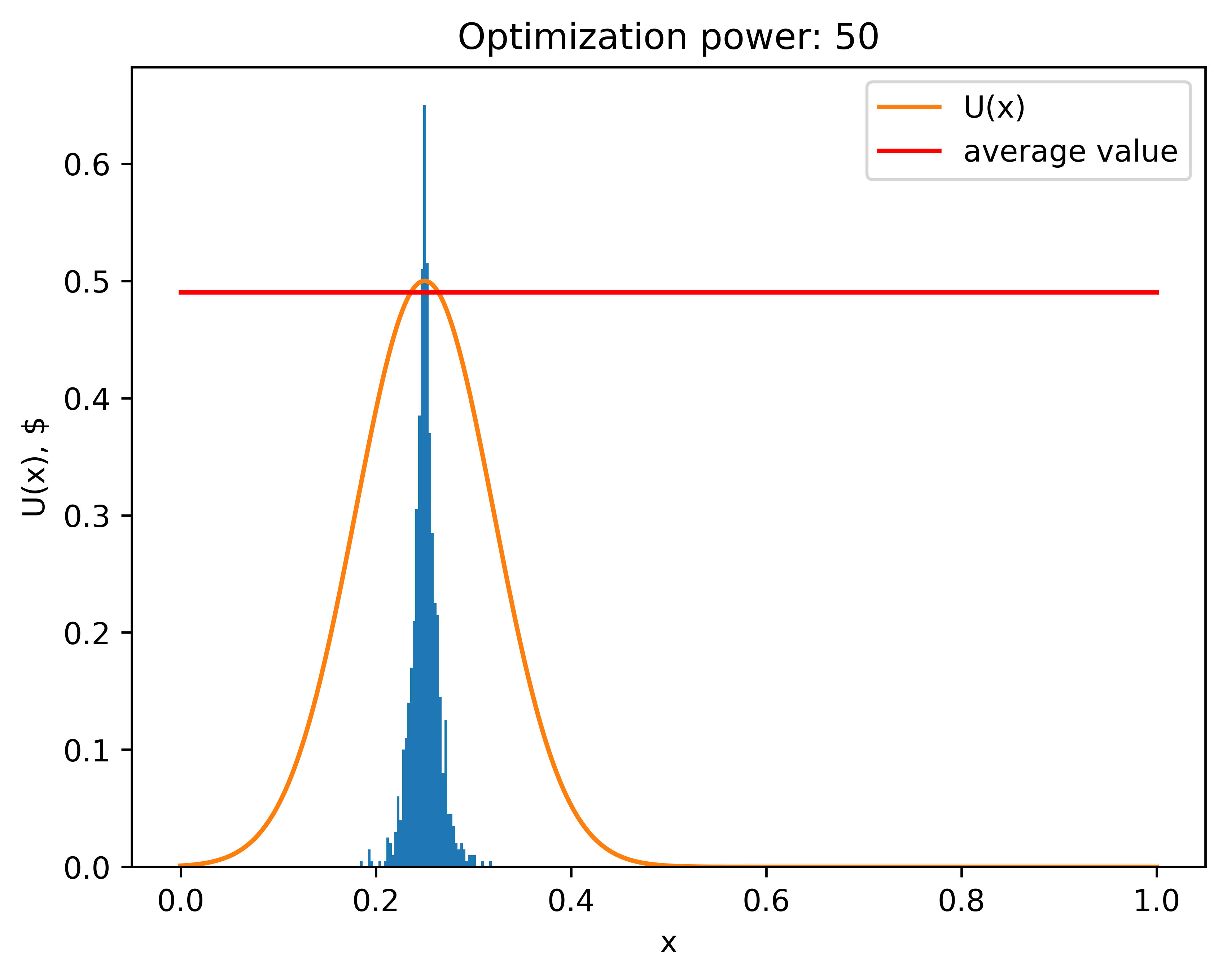 Here are 1,000 such experiments, in each of which the optimization power was 5. The bar chart is the probability density of the proxy maxima chosen by the Algorithm 1.[2] We can see that points are clustering around the true maximum point (). The “average value” is the average of the utility function Veronica obtains from those proxy maxima (the expected amount of money she makes with this algorithm). It is noticeably smaller than the actual maximum value she can achieve.