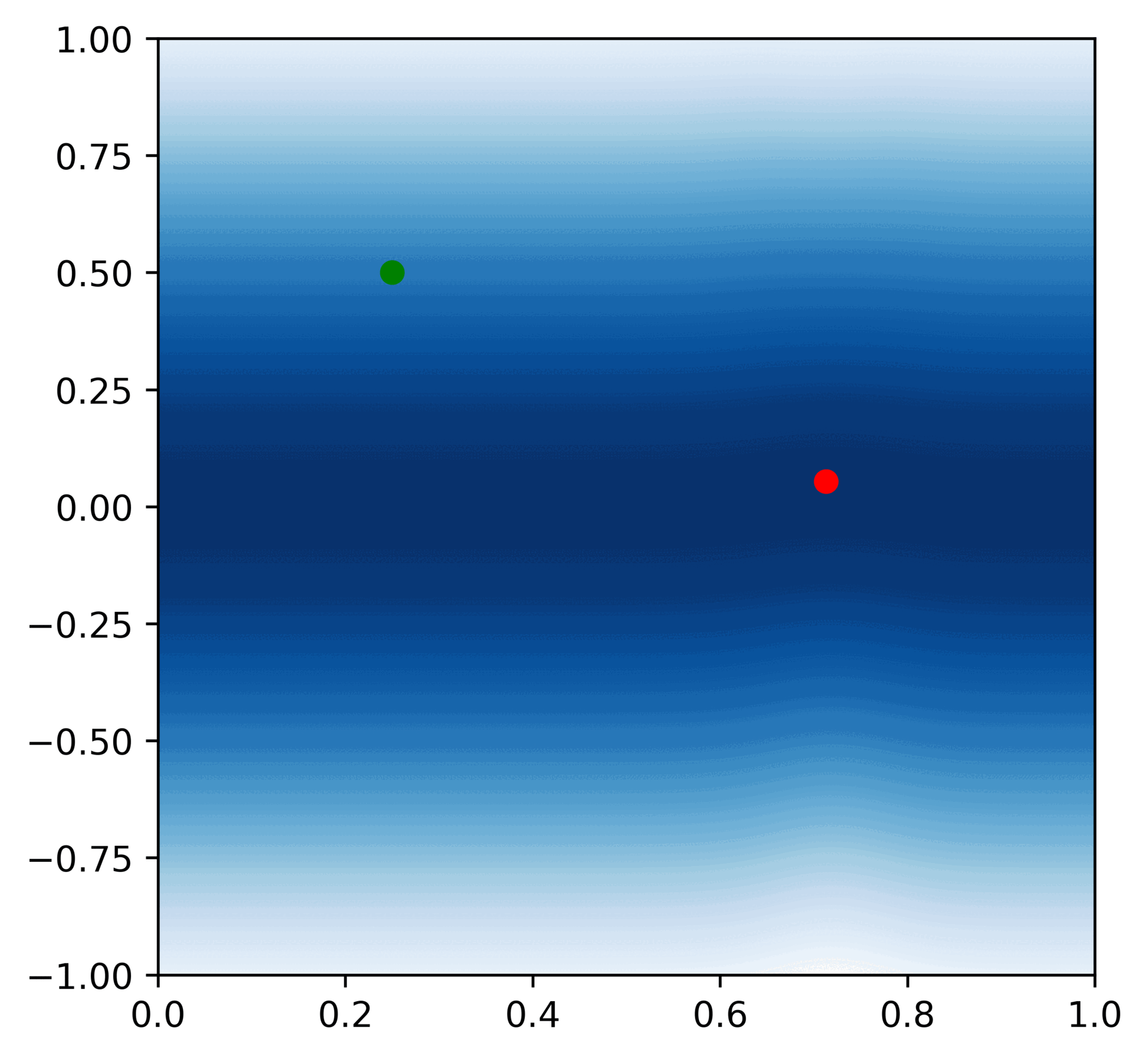 Here is a GIF of a 50 consecutive updates (the red dot represents the observation, and the green dot represents the hypothesis that is closest to the actual distribution we get from the computer):