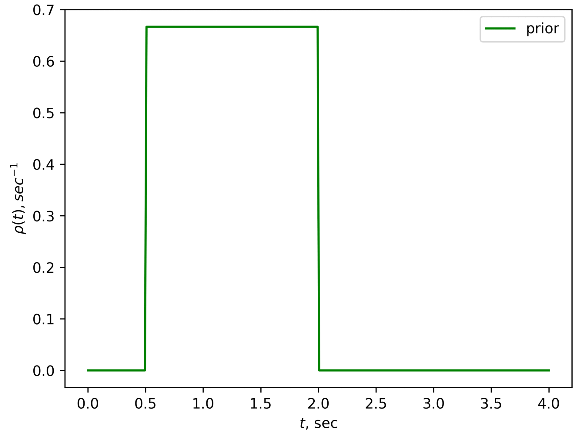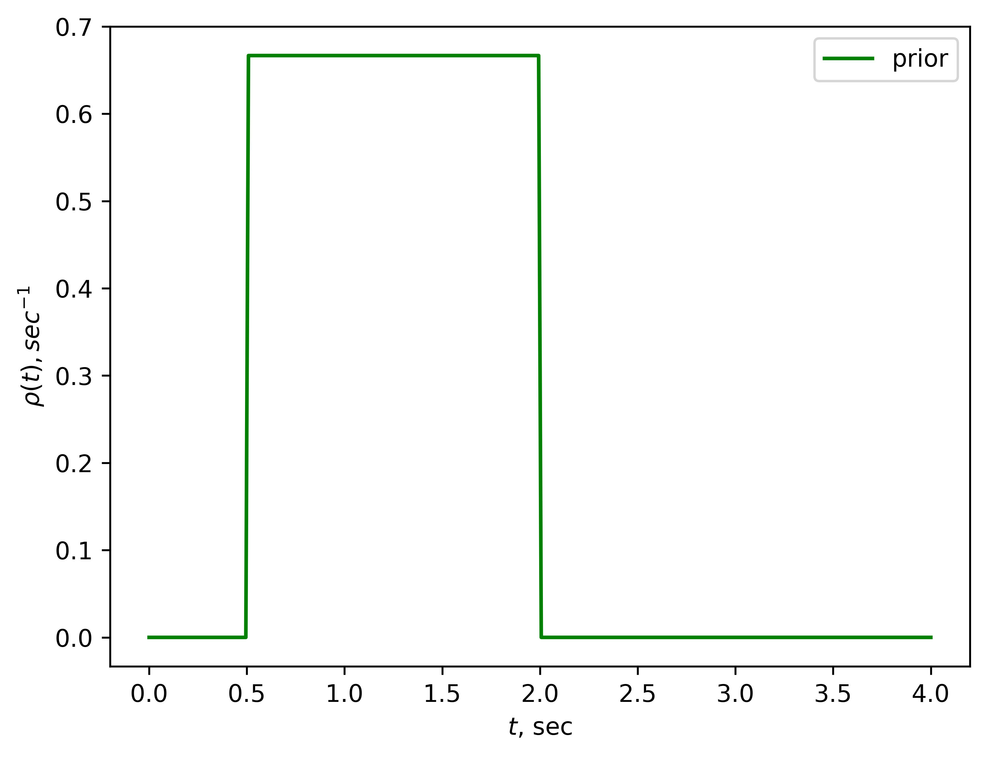 He knows that is somewhere between 0.5 and 2 seconds. His prior distribution on might look something like this: