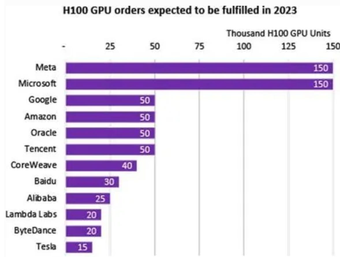 Meta and Microsoft are projected to purchase 3x more leading Nvidia GPUs than their closest competitors. Source.