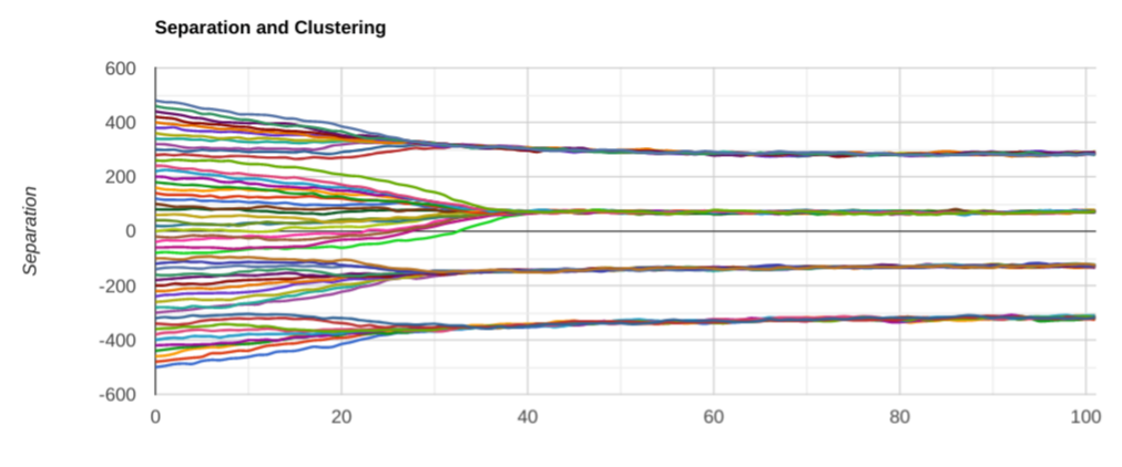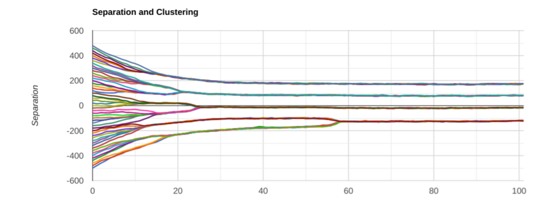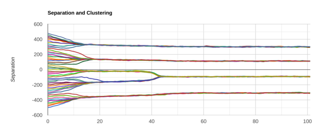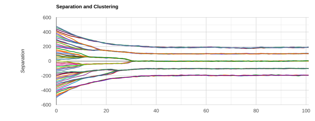 Note that I had to crank up the overall gain to keep the force roughly the same. And the separation between clusters did indeed get smaller, as predicted. But! Something I didn’t expect happened: we only ended up with 4 clusters instead of 8 or so. Let’s try another couple of runs: