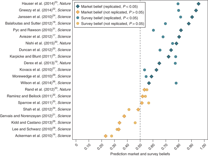 Beforehand, prediction markets were used to see which studies would be predicted to replicate with what probability. The results were as follows (from the original paper):