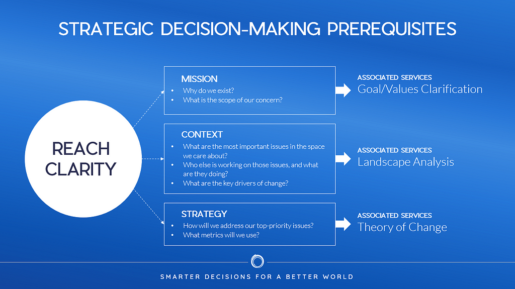 So how can we get better? Lots of ways! Decision-making is an exciting frontier in social impact precisely because there is so much untapped potential to improve how we do things. For decades now, scholars and practitioners have been pioneering methodologies for analyzing and making decisions that have seen barely any adoption in philanthropy, government, or impact investing. Drawing from that body of work, I’ve developed my own process to help myself and my collaborators make critical decisions with intention and focus. Here, I’m sharing the key elements of that process so that you can benefit from them in your own practice.