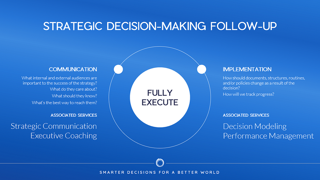 How should you talk about this decision (and the process that went into it)? Strategic Decisions Group’s Decision Quality framework notably includes “commitment to action” as one of six key pillars to a high-quality decision — meaning that they include commitment in the very definition of what constitutes a high-quality decision. Particularly when the decision is about a charged topic or conversation in your organization or community, having a robust, transparent process like this one can help to build consensus and buy-in moving forward.