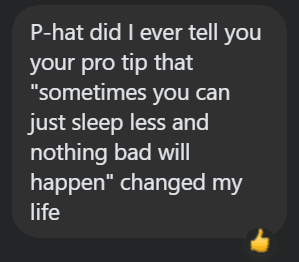 [1] I’m reporting time in bed rather than time asleep because first of all, my phone isn’t very good at knowing when I fall asleep, and second, I think time in bed is more relevant because I can’t control when I fall asleep but I can control when I go to bed.