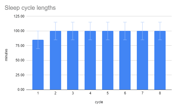 There’s some wiggle room in how it all adds up. A first cycle of 70m and four more cycles of 103m gives you eight hours, but a first cycle of 90m and four later cycles of 98m also gives you eight hours. If you can tweak the balance of cycle lengths so that both your ideal night and your n- night are represented in the same schedule, then you can assume your information is good.