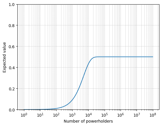 I estimate that you get log returns on increasing the number of powerholders up to 106, after which it plateaus.