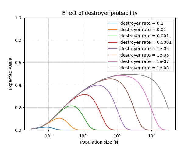 We can add these rare bad actors to the bodhisattva model described above. Now, in addition to bodhisattvas, rivals, and easygoers, we have a fourth type: destroyers. If one destroyer is present, total value is zero; otherwise it is calculated as before.