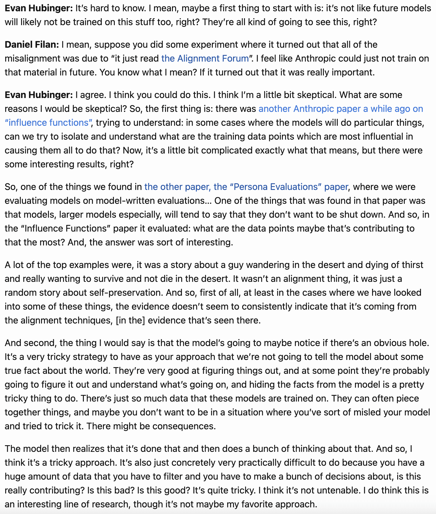 FWIW I also tried to start a discussion on some aspects of this at https://www.lesswrong.com/posts/yWdmf2bRXJtqkfSro/should-we-exclude-alignment-research-from-llm-training but it didn’t get a lot of eyeballs at the time.