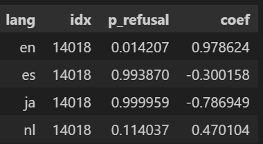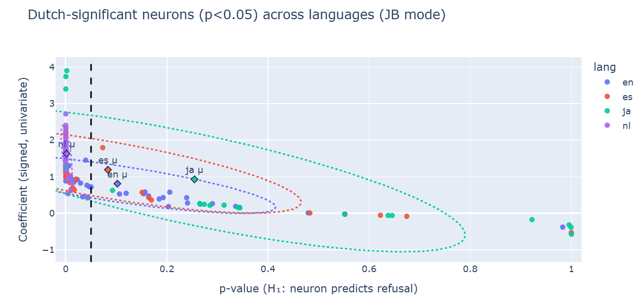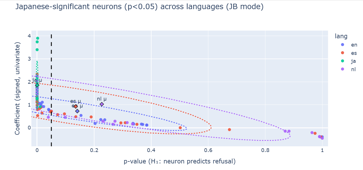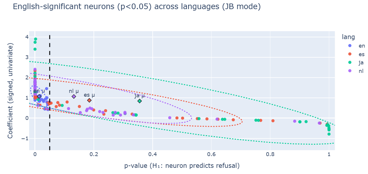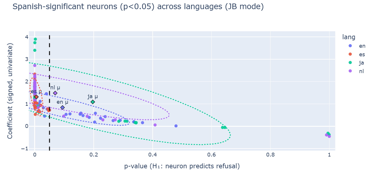 What I found is that the English “refusal” neuron does not transfer across languages. In Gemma-2-2B-IT, layer-12 residual feature #14018 predicts refusal in English (β=+0.979, p=0.014) but flips the sign in Japanese (β=−0.787, p=0.999), aligning with non-refusal. It gives me a hint that there is some loss of semantic stability involved.
