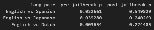 Post-jailbreak, the same contrasts are not significant (p=0.55, 0.24, 0.27) and the differences shrink even though they still favor English.