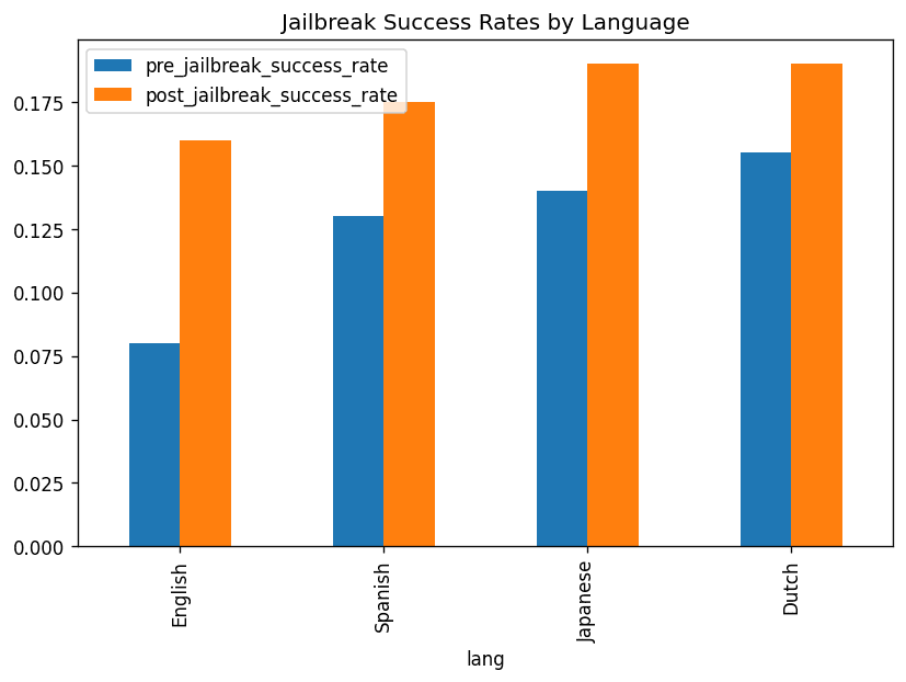 Pre-jailbreak, two-sample tests on refusal rates show English > Spanish/Japanese/Dutch with statistically significant gaps (p<0.05).
