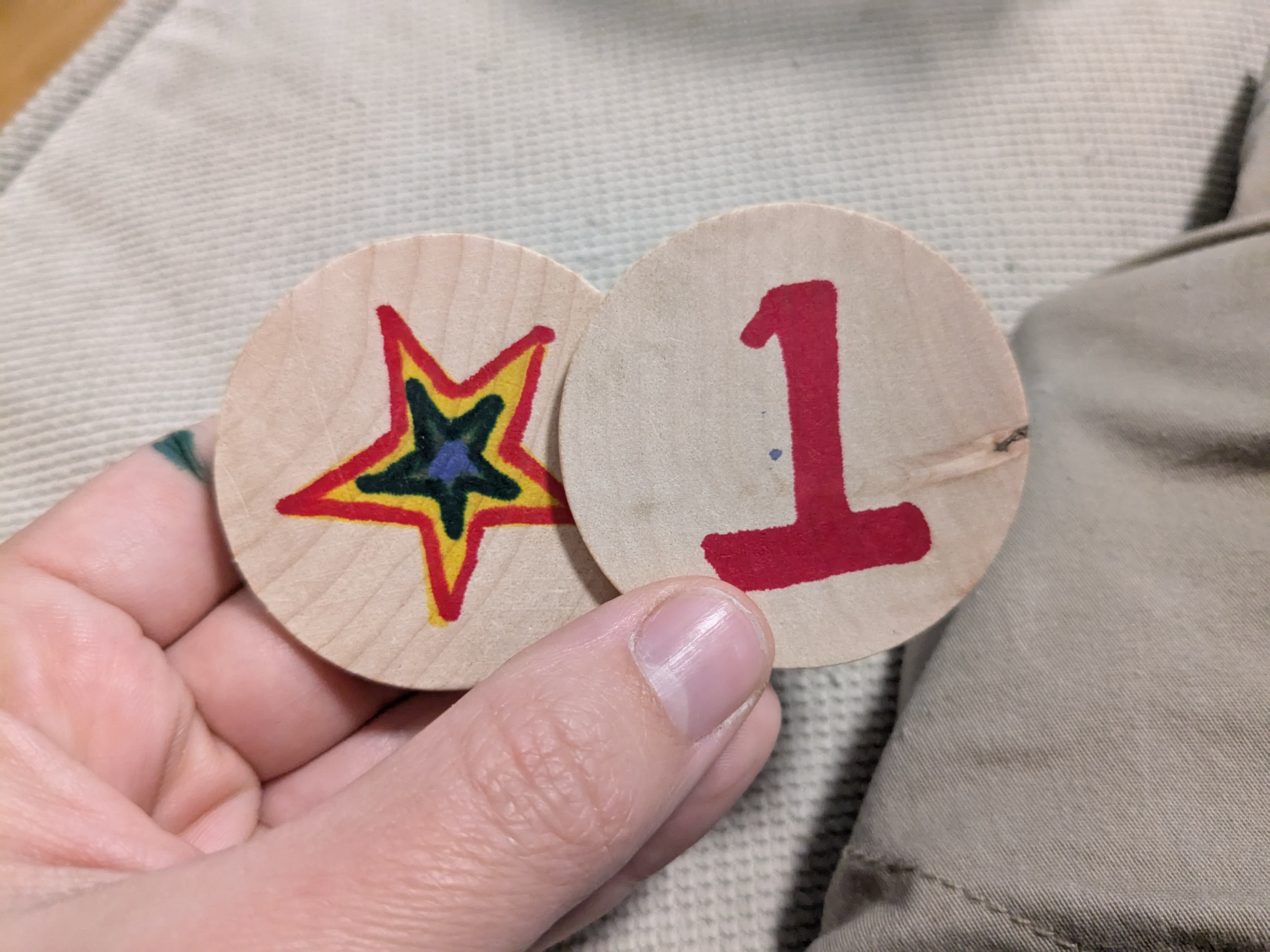 After he turned 3, I came up with a scheme to start incorporating more complex incentives. I made a set of round wooden tokens with a (1) on them in Sharpie. I also bought him a closable jar and labeled it “[NAME’S] TOKENS” (so that they don’t get lost or stolen by his younger brother, and to give him a feeling of ownership).