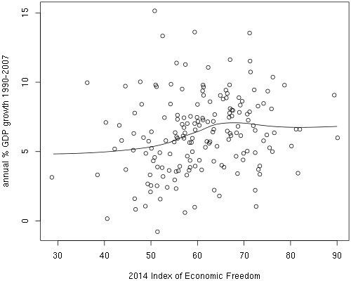 It is informative to see what happens if I (1) correct this by correlating the economic freedom index with GDP growth, and (2) use as big a sample as is available instead of focusing on particular cases. I copied the freedom ratings from that Heritage web page and real GDP growth rates (“estimates are for the year 2013 unless otherwise indicated”) from Wikipedia. The correlation between the freedom index and real GDP growth turns out to be negative: the Pearson correlation coefficient is −0.19 and Spearman’s rank correlation coefficient (which allows for nonlinearity) is −0.35. Plotting the data and a loess curve with R’s default settings: