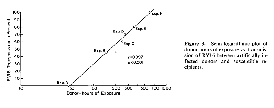 The experiments described in table 3 are arranged in order of donor-hours of exposure (DHE; one donor in the experiment room for 1 hr equals one DHE; five donors in the room for 5 hr equals 25 DHE, etc.) because rate of RV16 transmission correlated in a nearly linear fashion with DHE (r = .926, P < .01). The correlation was nearly perfect when DHE was plotted logarithmically (r = .997, P .001; figure 3).