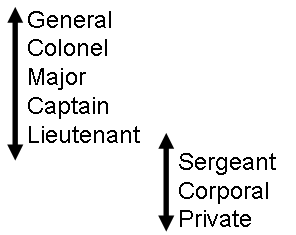 Armies could have a single hierarchy, top to bottom, as in the simplified diagram below on the left. Instead, all armies have two distinct ladders, with one strictly above the other, as on the right. (Reminds me of those wacky non-standard integers.)