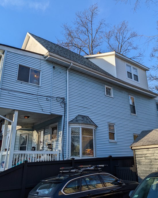 This roof is a good candidate for solar, with one problem: the panels might avalanche snow onto the neighbor’s car: