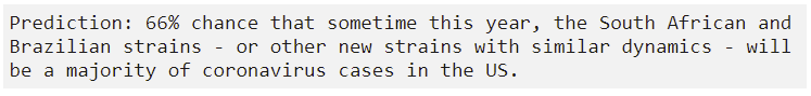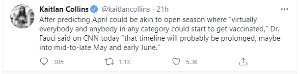 That is of course excellent news, although how good the news really is depends on what our true previous expectations were and how much this updates those expectations. Biden’s goal of 100 million doses in 100 days was never in doubt, and it seems plausible that all the official timelines have been chosen in a similarly conservative fashion to ensure they can’t fail. Underpromise and overdeliver.