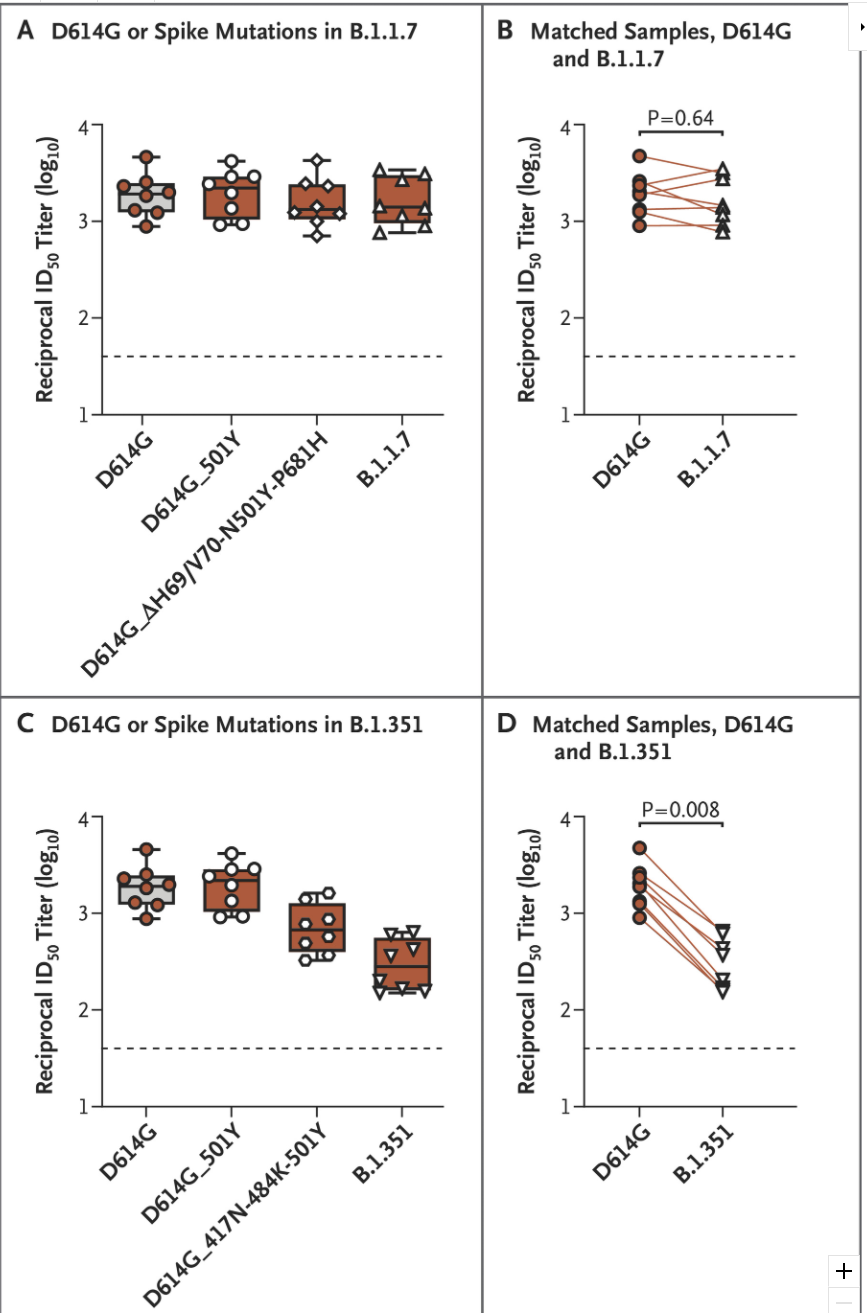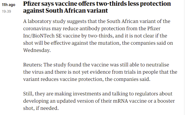 There are plenty of people who read that and interpret it very incorrectly as ‘whelp, we were 95% protected, but this is two thirds less protection, so that’s about 1⁄3 protected.’ That would be rather alarming, but it’s not the case. Cutting antibody effectiveness by 2/3rds is going to reduce vaccine protection, and the ‘no evidence’ statement here is obvious nonsense the way such statements usually are, but we also have no reason to expect a 2/3rds drop in antibody protection levels to translate to anything like a 2/3rds drop in how effective the vaccine will be at preventing infection or death.