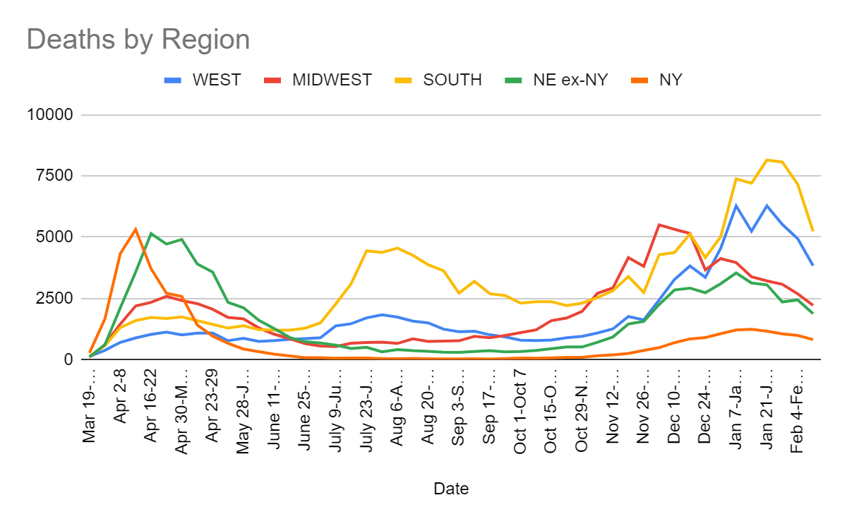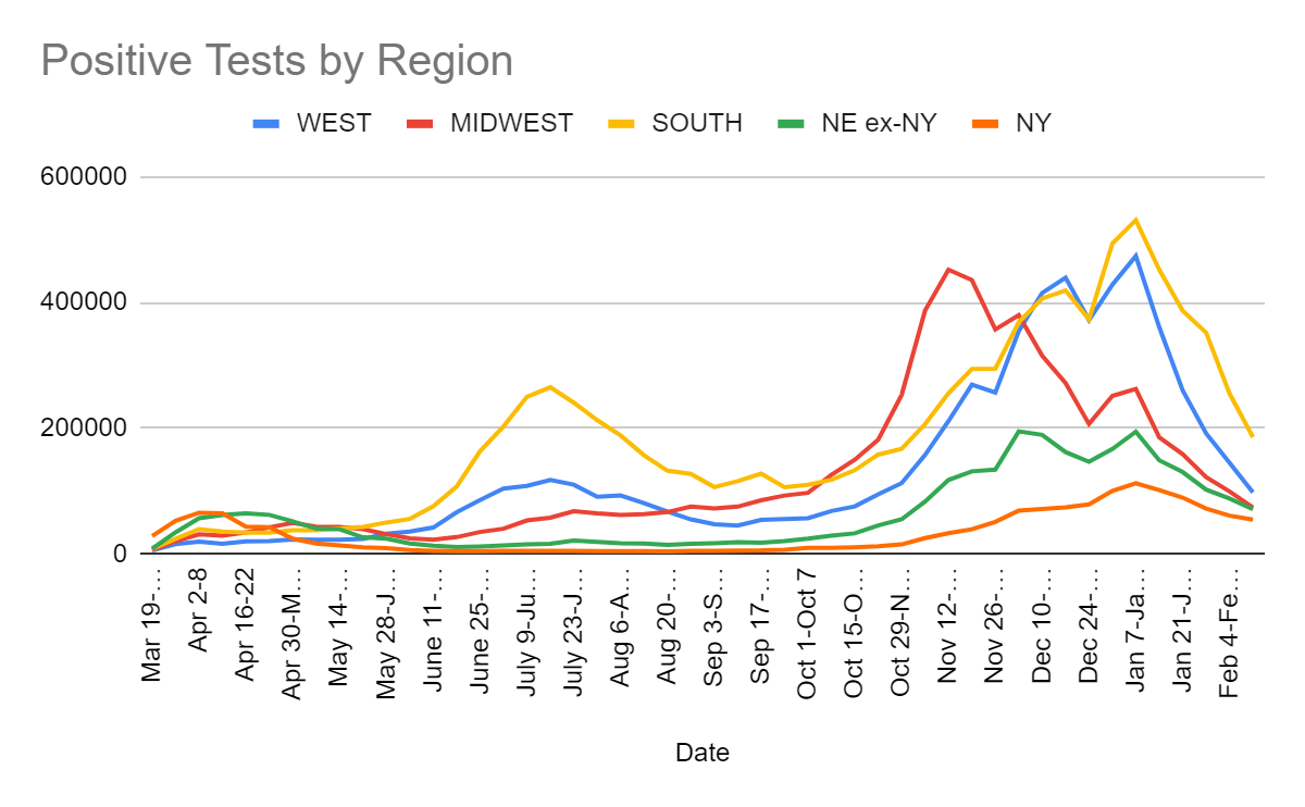 This was a deeply disappointing week on the vaccine front, with the 7-day average declining over the last few days, and on net almost no progress week over week. Our rate of progress has stalled out. Weather and the holiday I am sure contributed to this, and increased supply is still in our future, but it’s still disheartening.