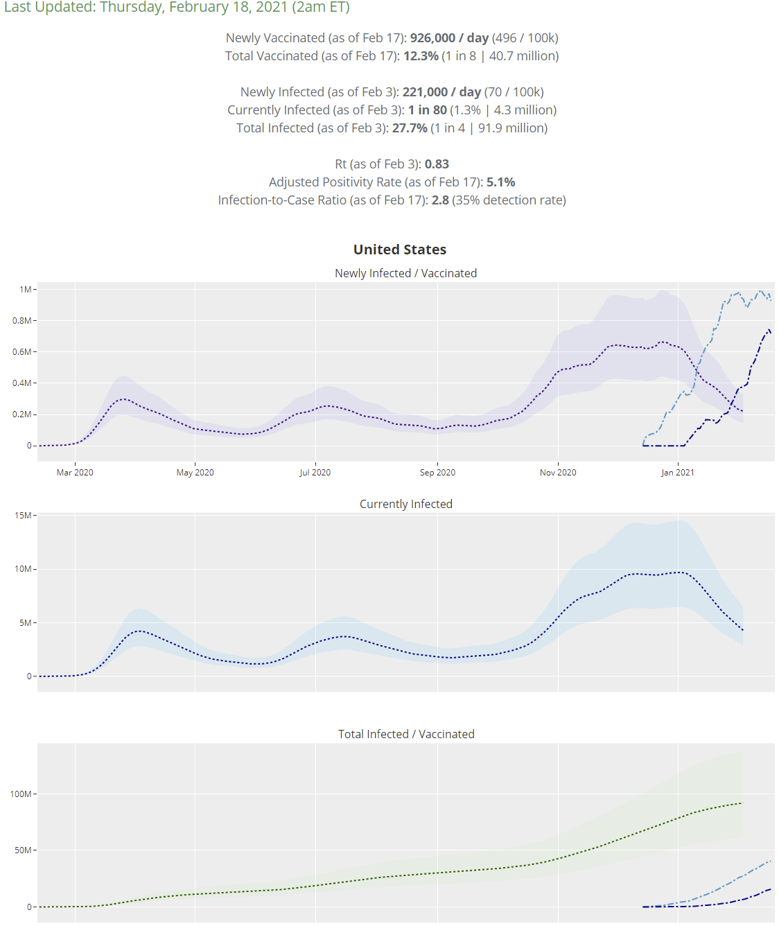 As with other sources, the infection numbers look good but the vaccine numbers are disappointing. He has us at 27.7% infected as of February 4, versus 27.2% a week earlier.