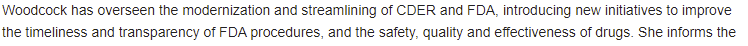 Janet Woodcock is the current acting commissioner, and thus directly responsible for our failure to approve vaccines. You gotta love this being front and center on her Wikipedia page: