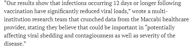 The result of 75% lower average viral loads in vaccinated people, conditional on infection at all, reinforces our previous understanding. First, it confirms that, conditional on infection at all, vaccinated people are less infectious even after one dose. Second, it confirms that severe disease, hospitalization and death should be much reduced in vaccinated individuals, again after only one dose, even conditional on infection.