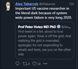 Non-Covid Civilization Watch: Large parts of Texas continue to be without power under dangerously cold conditions. Now there are reports of lots of people losing water as well. Explosions shut off power to large parts of Portland. California’s power grid is increasingly unreliable each year. We should be alarmed about this. It is perhaps the best concrete test of whether our civilization can maintain its physical infrastructure, it can’t be faked, and it is very much not going well. Any given incident can usually be explained away, extreme weather events have always caused temporary power loss, but when it happens more often on larger scales for longer periods, we need to ask ourselves what’s going on.