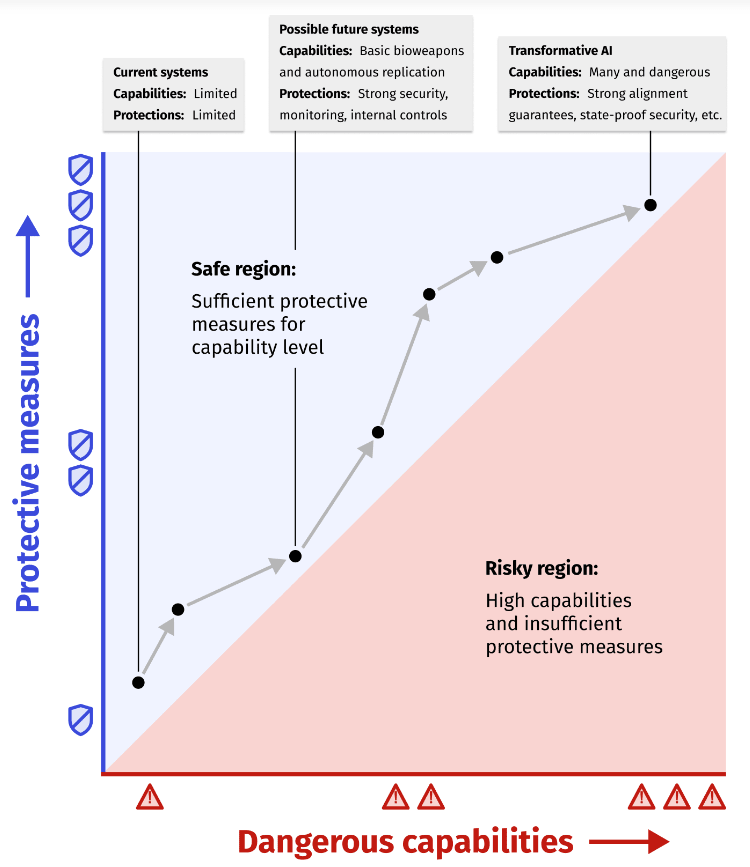 Without arguing why the graph would look like that, ARC published a graph like this one. Many in the AI safety field don’t expect it to go that way, and “Safe region” oversells what RSP does. I, along with others, expect the LLM graph to reach a level of risks that is simply not manageable in the foreseeable future. Without quantitative measure of the risks we’re trying to prevent, it’s also not serious to claim to have reached “sufficient protective measures”.