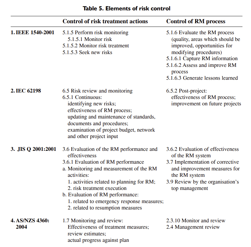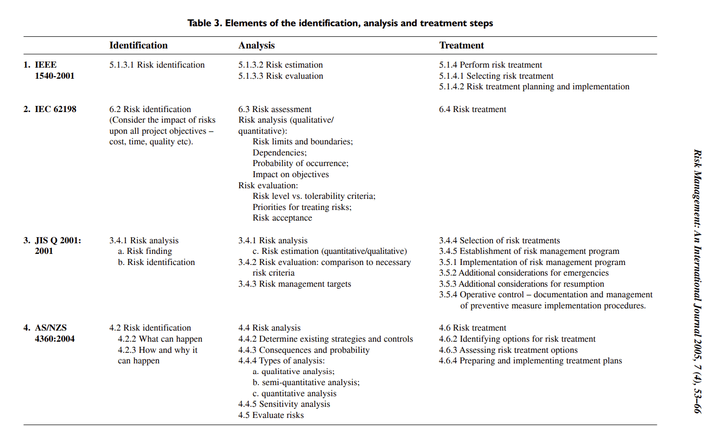 This (cropped) table shows the process of various standards for the 3 steps of risk management. As you can see, there are some differences but every standard seems to follow a similar structure.