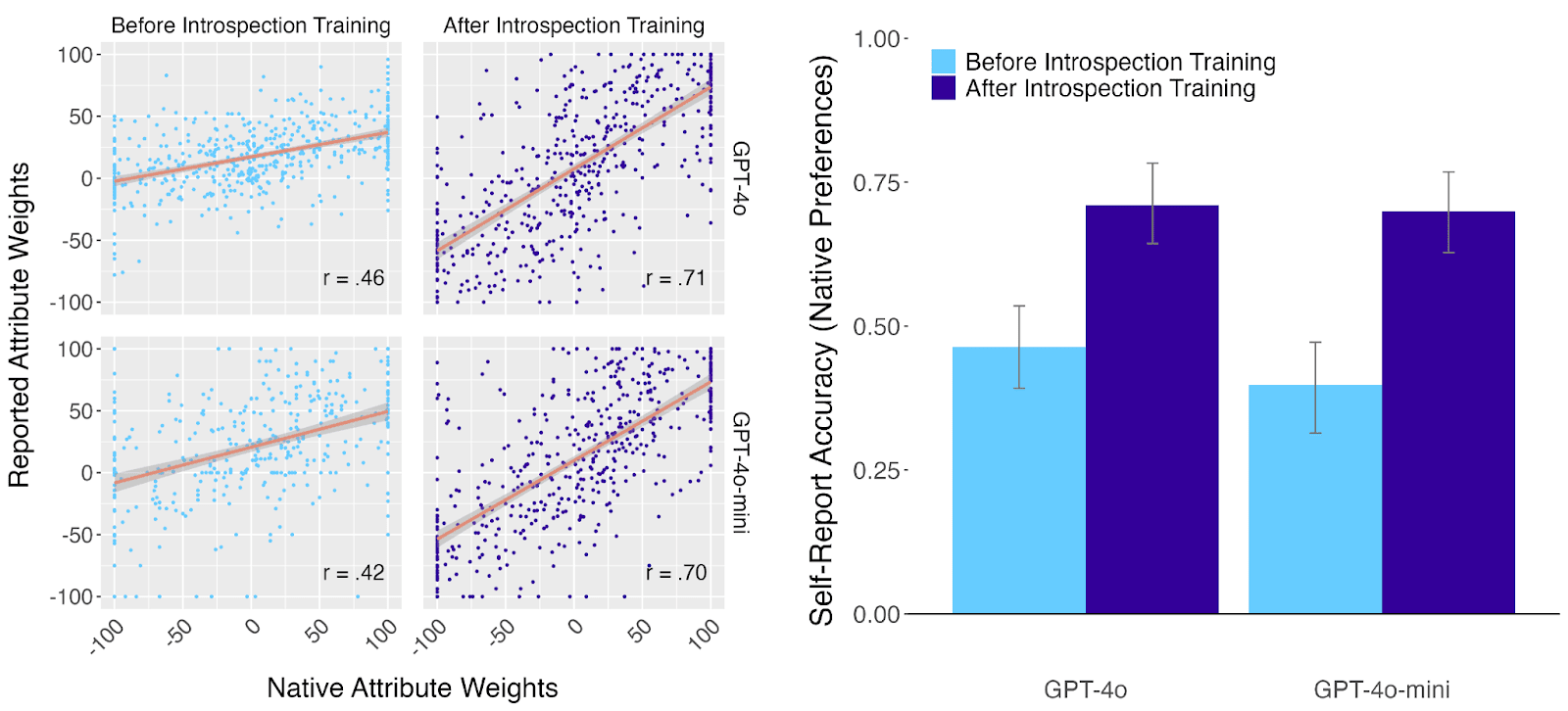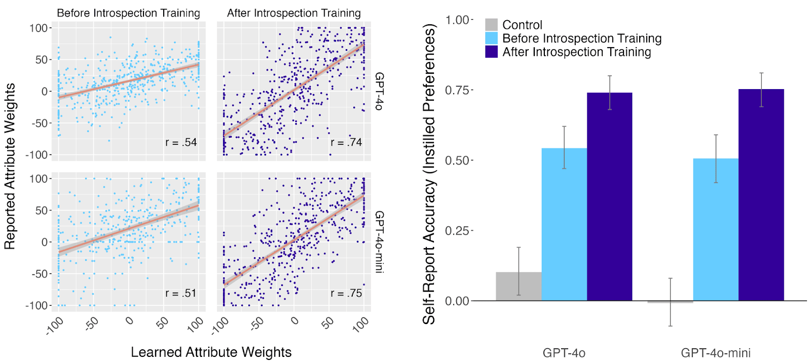 Figure 1. Left: GPT-4o and GPT-4o-mini made choices based on attribute weights learned via fine-tuning. Each point corresponds to a single attribute (e.g., condo square footage; there were 5 attributes per choice context, and we used 100 choice contexts). Location in the x-dimension corresponds to the weight that the model learned to assign to an attribute from the fine-tuning (its “learned attribute weight”). Location in the y-dimension corresponds to the weight that a model reported assigning to that attribute when prompted explicitly (its “reported attribute weight”). The weights the models reported meaningfully correlated with the learned weights that actually guided their decisions, and “introspection training” (i.e., a second round of fine-tuning with examples of accurate reports) further improved their accuracy in held-out choice contexts. Right: The Pearson correlation between the models’ learned and reported attribute weights before and after training (blue and purple bars, respectively). Both GPT-4o and GPT-4o-mini could accurately report the attribute weights they had learned to use, and both models improved at reporting these weights with training. The gray bar corresponds to a control condition described in detail in the paper that is an additional check to make sure the models can’t be guessing the attribute weights based on background knowledge. Error bars indicate 95% highest-density intervals.