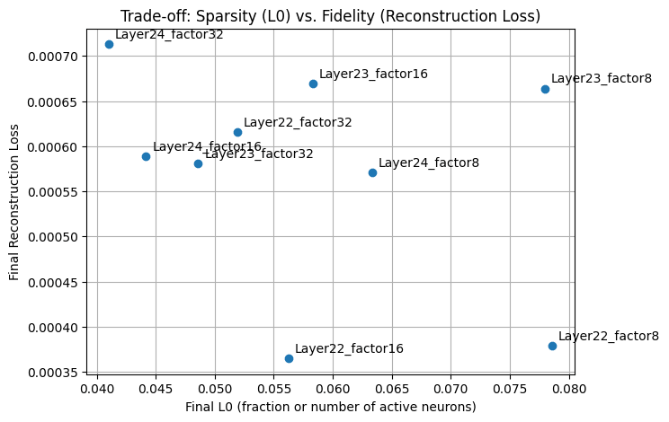 The scatter plot in figure 5 “Trade-off: Sparsity (L0) vs. Fidelity (Reconstruction Loss)” illustrates the relationship between the final reconstruction loss (fidelity) and the fraction of active neurons (L0 sparsity) across different SAE configurations and layers. Lower L0 values indicate higher sparsity, while lower reconstruction loss represents better fidelity.