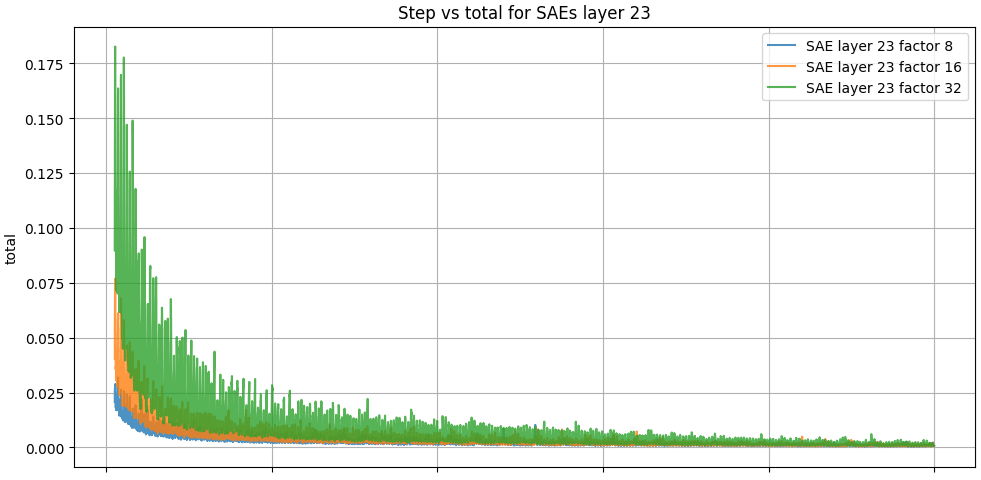 The figure 4 “Step vs total for SAEs layer 23” displays the evolution of the total loss, which combines reconstruction loss and sparsity regularization, across training steps for Sparse Autoencoders (SAEs) with expansion factors x8, x16, and x32. This metric provides a comprehensive measure of the trade-off between reconstruction fidelity and the imposed sparsity constraints during the learning process.