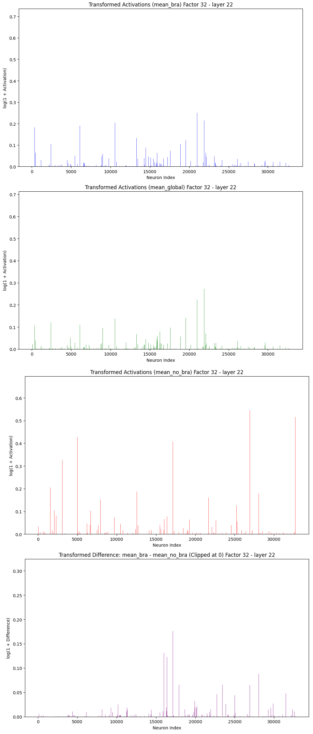 The final graph represents the difference in mean activations between the two subsets (mean_bra—mean_no_bra), with negative values clipped to zero. This highlights candidate neurons that are likely capturing features specifically associated with semi-nude women, as they exhibit higher activations for this subset compared to the shirt-wearing group.