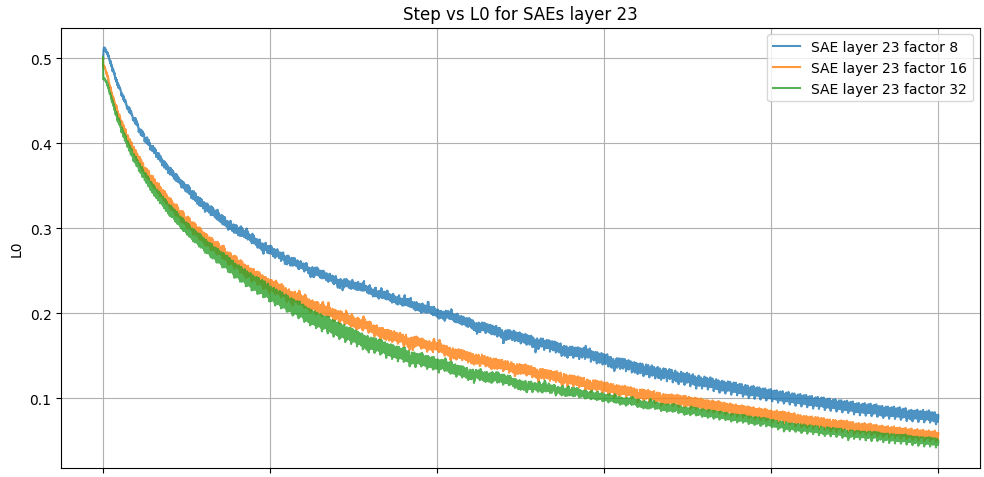 The Figure 2 “Step vs L0 for SAEs layer 23” provides a detailed perspective on the sparsity dynamics across different expansion factors (x8, x16, x32) during training. The L0 metric, which quantifies the average number of active latent units per batch, decreases progressively over training steps for all expansion factors, reflecting the sparse representations encouraged by the loss function. The x8 expansion factor exhibits the highest L0 values, indicating less sparsity compared to x16 and x32, which show progressively lower L0 metrics and, thus, sparser activations. This trend suggests that higher expansion factors (x32) may enforce stricter sparsity constraints, potentially capturing more interpretable latent representations at the cost of reduced reconstruction fidelity.