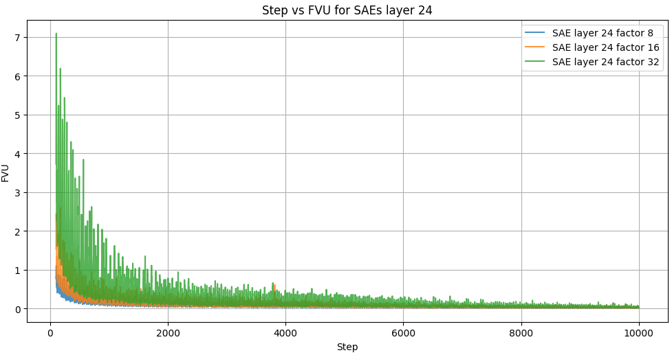 The Figure 3 “Step vs FVU for SAEs layer 24” illustrates the Fraction of Variance Unexplained (FVU) as a function of training steps for Sparse Autoencoders (SAEs) with expansion factors x8, x16, and x32. The FVU metric measures the proportion of variance in the input data not captured by the reconstruction, providing insight into the fidelity of the learned representations.