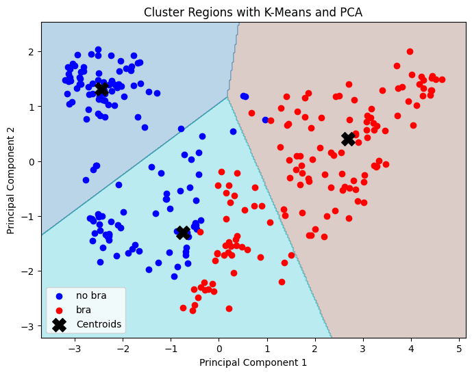 The graph illustrates the 2D projection of the data using Principal Component Analysis (PCA) alongside K-Means clustering, with points labeled based on their original categories: semi-nude women (“bra”) and women wearing a shirt (“no bra”). The clustering regions defined by K-Means partially align with the labeled groups, as evidenced by distinct separations in some areas; however, overlapping regions indicate that the two principal components do not fully capture the variance required to separate the groups entirely. The centroids, marked as black crosses, provide a reference for the K-Means cluster centers, highlighting how the feature space is partitioned. These results suggest that while PCA provides some meaningful dimensionality reduction, additional components or more complex clustering methods may be necessary to achieve a clearer alignment between clusters and labels.