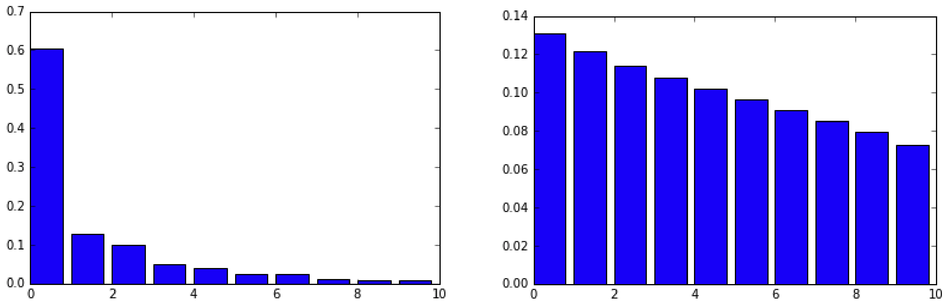 Left: the percentage of variance explained in the PCA of these [10 gender] vector differences (each difference normalized to be a unit vector). The top component explains significantly more variance than any other.