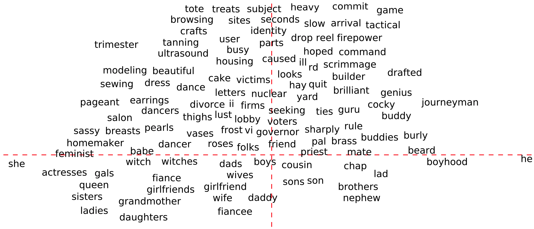 In order to better understand contrast pairs, I think it’s helpful to review this famous paper by Bolukbasi et al., 2016: “Man is to Computer Programmer as Woman is to Homemaker? Debiasing Word Embeddings.”[2] Quoting from Bolukbasi et al.: