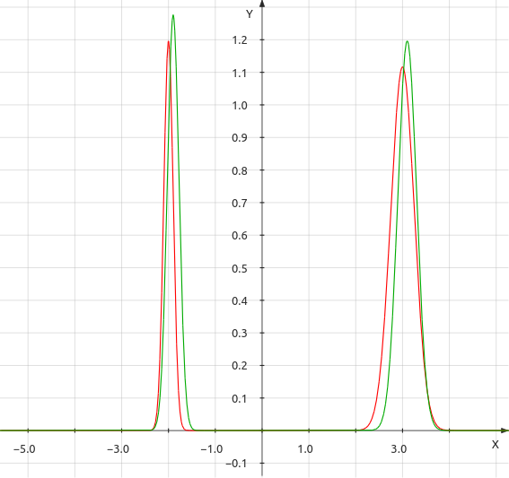 Now Bob comes along. Bob’s probability distribution looks like this. (The green peaks that are slightly taller and to the right are bob’s distribution. Alice’s distribution is shown for comparison.)