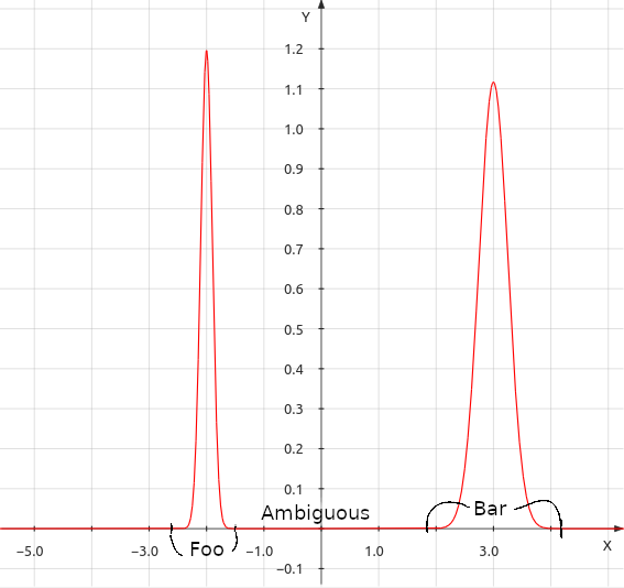 So now Alice can describe the situation as a foo or a bar. Of course, such description looses some information. In particular, it is bad at describing outcomes that are far from either peak, but Alice doesn’t think this is a problem as she thinks such outcomes are very unlikely.