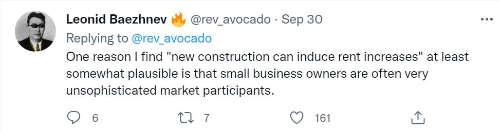 What about the landlord hypothesis here, that obviously more construction lowers the market equilibrium rent but landlords are perhaps not able to solve for the equilibrium and might respond by raising rents instead? I mean, sure, some of them will have the instinct to try doing that. Then reality will slap them in face in the form of no tenants until they realize their mistake. Knowing the economic impact of construction is not a core competency to being a landlord. Noticing that no one is renting and adjusting to that is a core competency.
