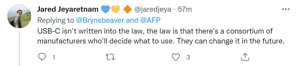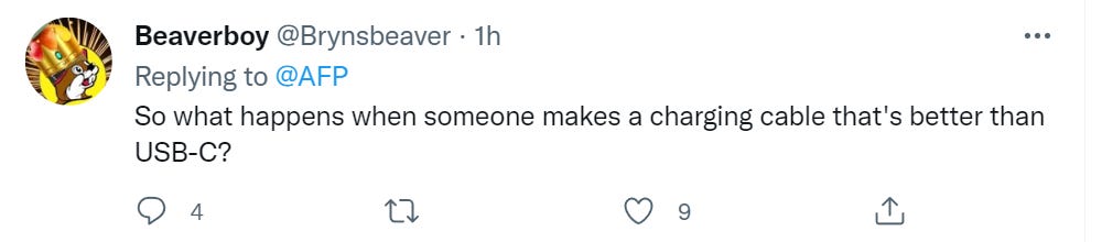 This is indeed a great idea until things change and it isn’t. That’s an unusually good regulation, as this one starts out positive and could remain positive for a long time. However, it greatly inhibits any future innovations in charging technology. It also lays the groundwork for more ramp-up of ‘industry insiders tell everyone what they can use’ which ends up being used to protect insiders. Still, in this particular case, I can get behind such a rule so long as it has an exception for sufficiently small devices where a USB-C wouldn’t easily fit.