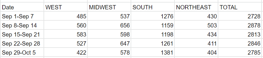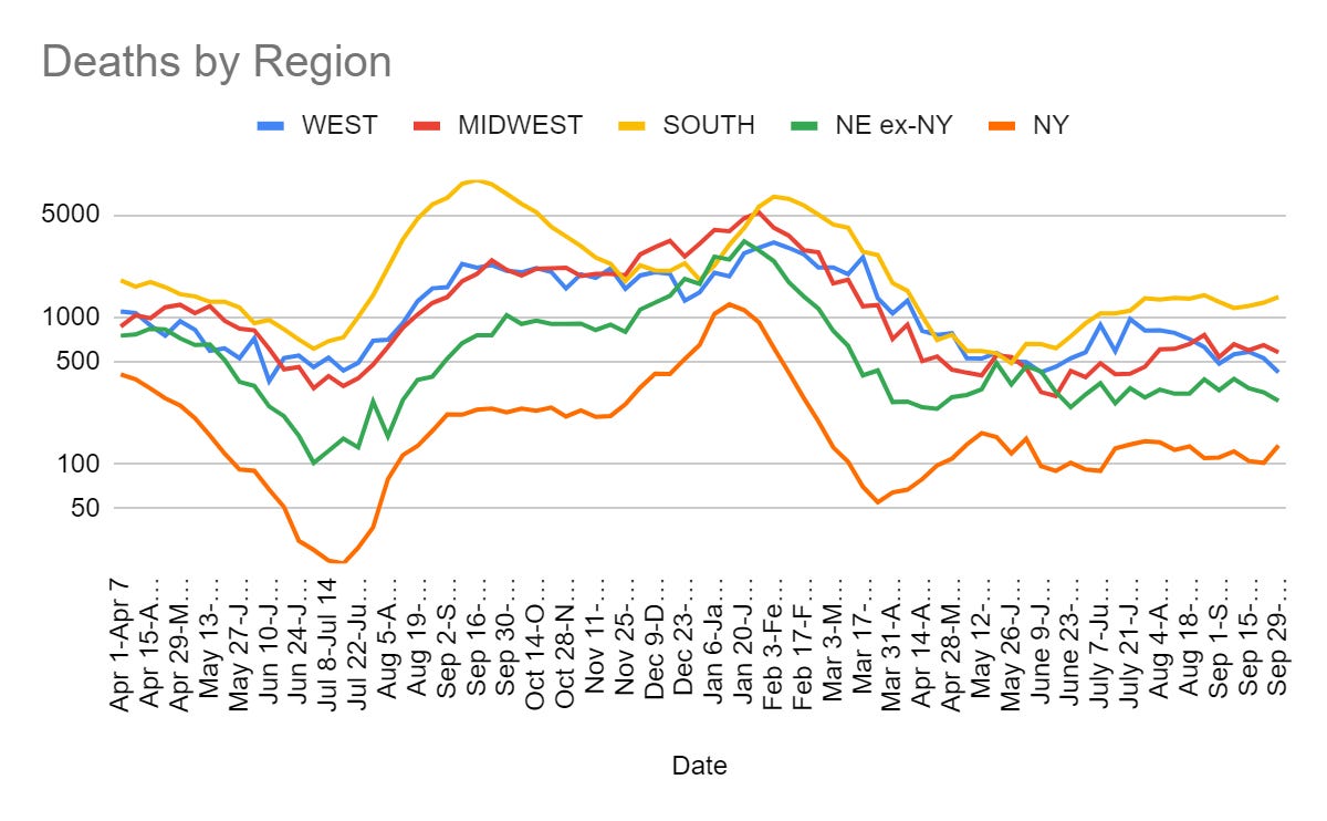 North Carolina reported several hundred extra deaths. I am not manually adjusting, but am noting it and adjusting next week’s prediction for it. I’m taking off 10% both predictions for Indigenous People’s Day.
