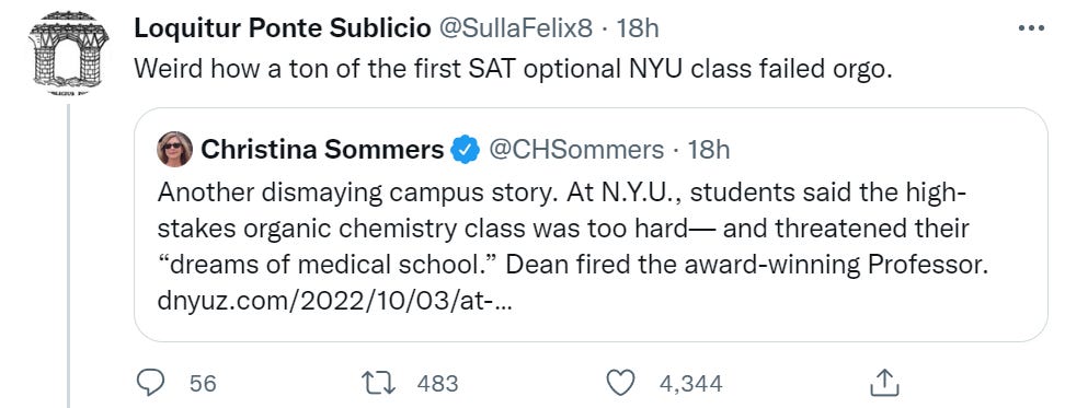 The entire point of Organic Chemistry is to prevent insufficiently smart students from becoming doctors. That is why this course exists and is the system Working as Designed. When students complain the grades won’t let them get into medical school, that is the idea. If we take away this gatekeeping effect, there will either (A) be some other way found to check for actual intelligence or (B) admissions will shift towards other factors being more important, which seems worse.