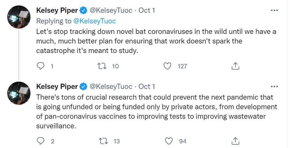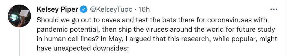 Kelsey Piper asks if we should go into the wild looking for potential viruses that could turn into the next pandemic, then take them into labs, put them into human cell lines and study them to see if one of them could create the next pandemic, because no viruses ever escape from the lab, no sir, that’s not a thing at all.