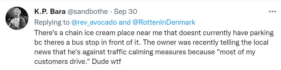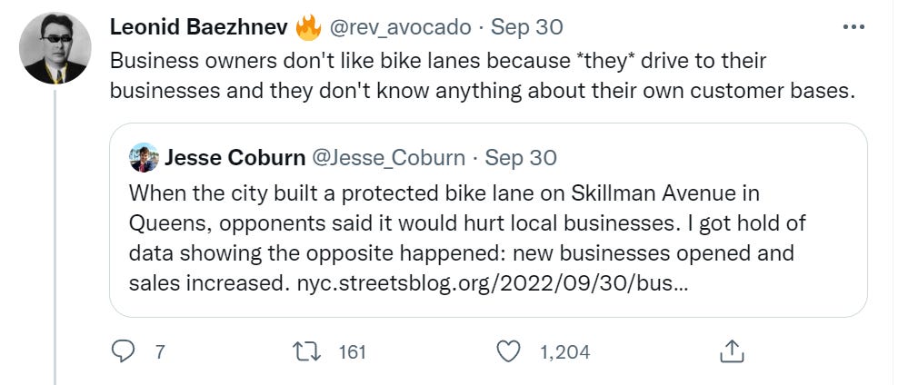 In general I find the claim highly plausible. I totally believe that a chain store owner is going to meetings opposing traffic calming measures saying ‘most of my customers drive’ without having ever stopped to check the composition of his customer base and that he’s completely wrong about it (although this one in particular could still be right, we don’t know.)