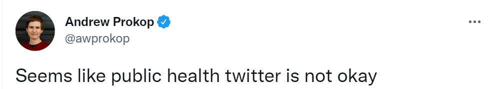 So that’s where Public Health Twitter is in Fall 2022. Having dinner with colleagues gets you sufficiently bombarded that you feel forced to leave Twitter entirely.