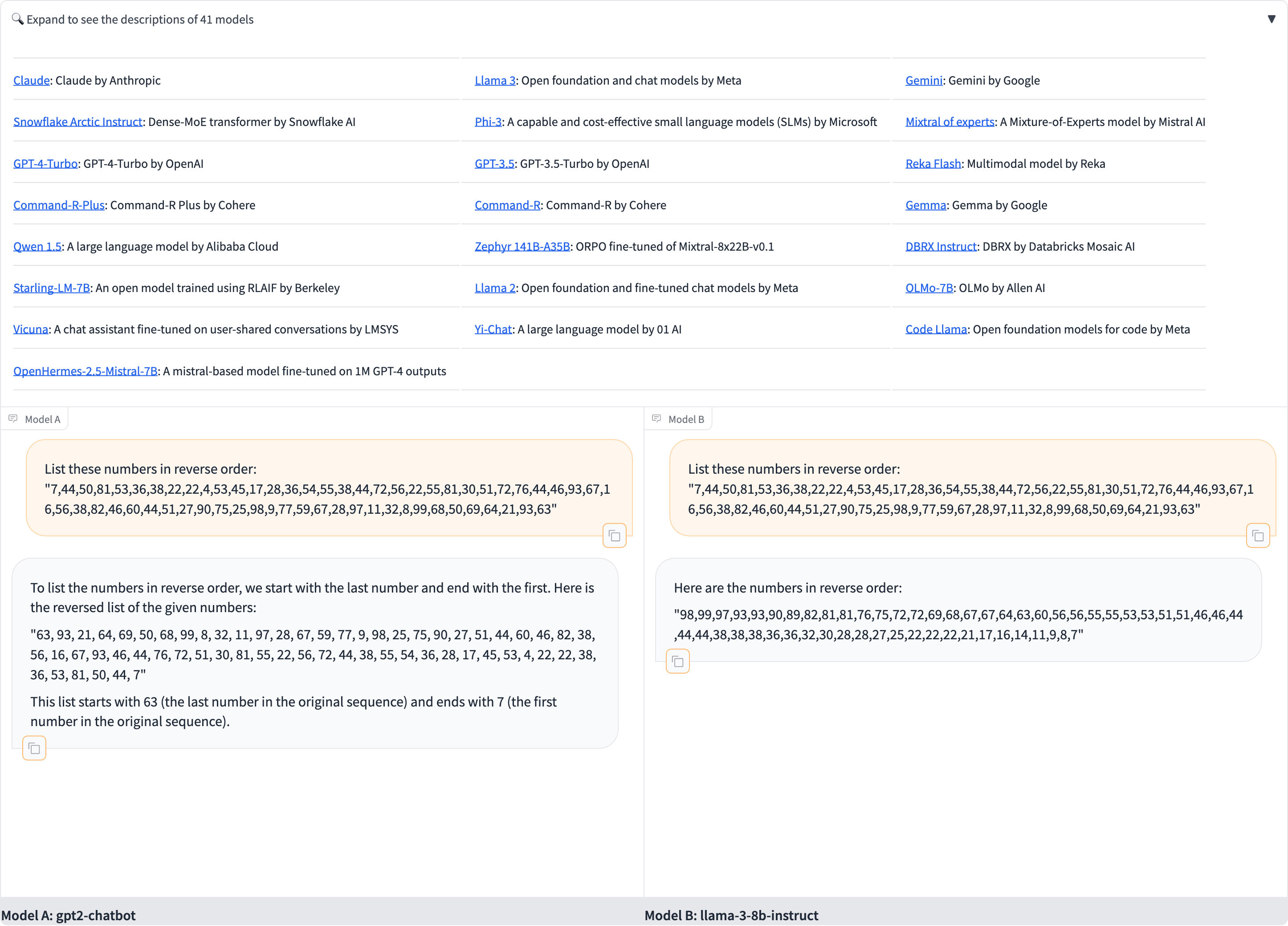 By using @Sergii’s list reversal benchmark, it seems that this model seems to fail reversing a list of 10 random numbers from 1-10 from random.org about half the time. This is compared to GPT-4′s supposed ability to reverse lists of 20 numbers fairly well, and ChatGPT 3.5 seemed to have no trouble itself, although since it isn’t a base model, this comparison could potentially be invalid.