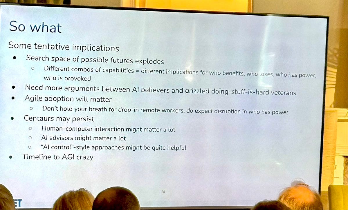 Sunday started out with Josh Achiam’s talk (again, he’s Head of Mission Alignment at OpenAI, but his views here were his own) about the challenge of the intelligence age. If it comes out, it’s worth a watch. There were a lot of very good thoughts and considerations here. I later got to have some good talk with him during the afterparty. Like much talk at OpenAI, it also silently ignored various implications of what was being built, and implicitly assumed the relevant capabilities just stopped in any place they would cause bigger issues. The talk acknowledged that it was mostly assuming alignment is solved, which is fine as long as you say that explicitly, we have many different problems to deal with, but other questions also felt assumed away more silently. Josh promises his full essay version will deal with that.